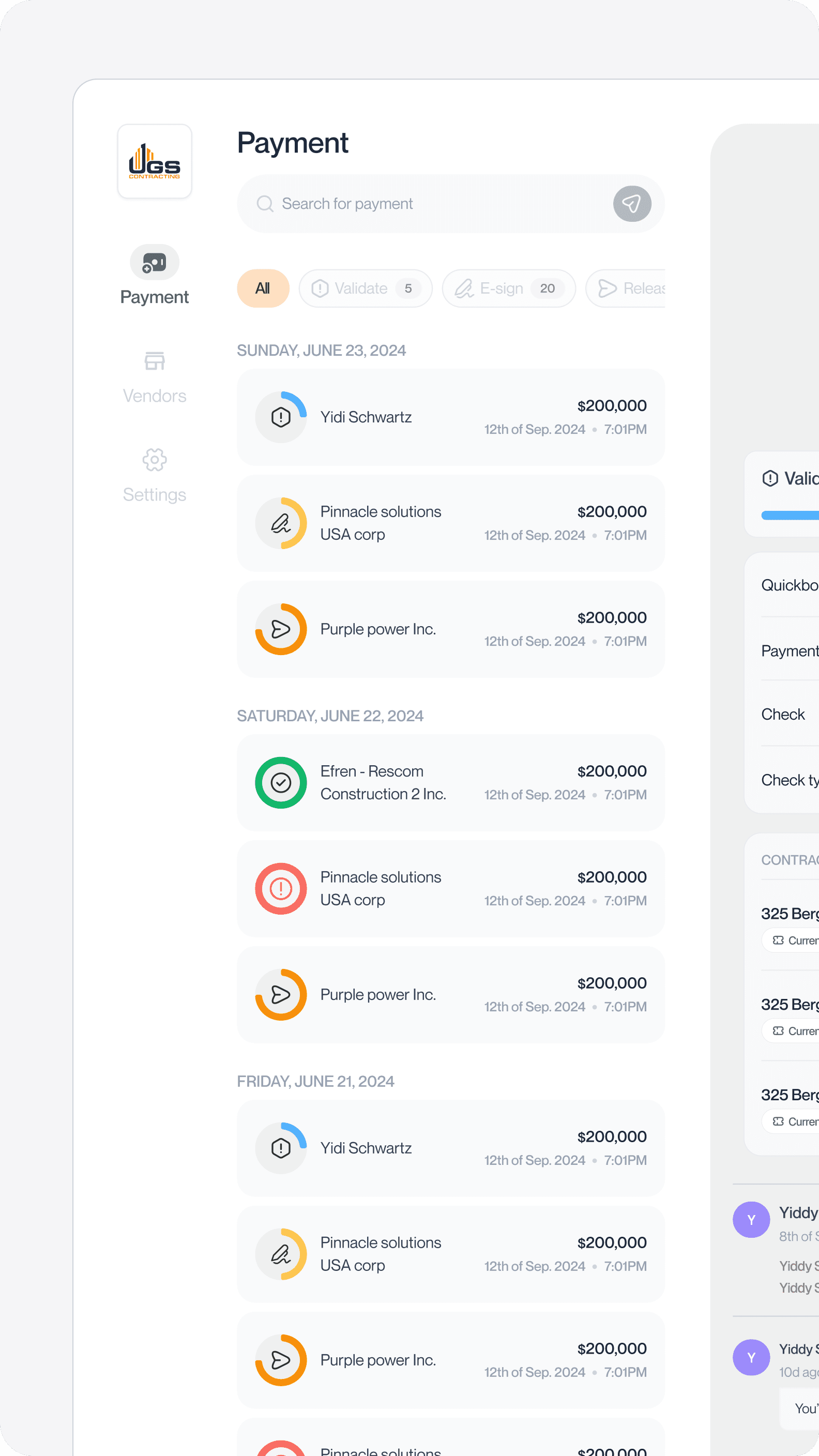 Those flows guided the wireframe stage, where we refined layouts and navigation to ensure clarity, minimal friction, and consistency across both mobile and web. Once the foundational structure was in place, I moved into high-fidelity designs, building interfaces that reflect UGS’s brand values of precision and trust—clean visual hierarchy, clear status indicators, and purposeful feedback mechanisms where project updates and lien statuses are instantly visible.